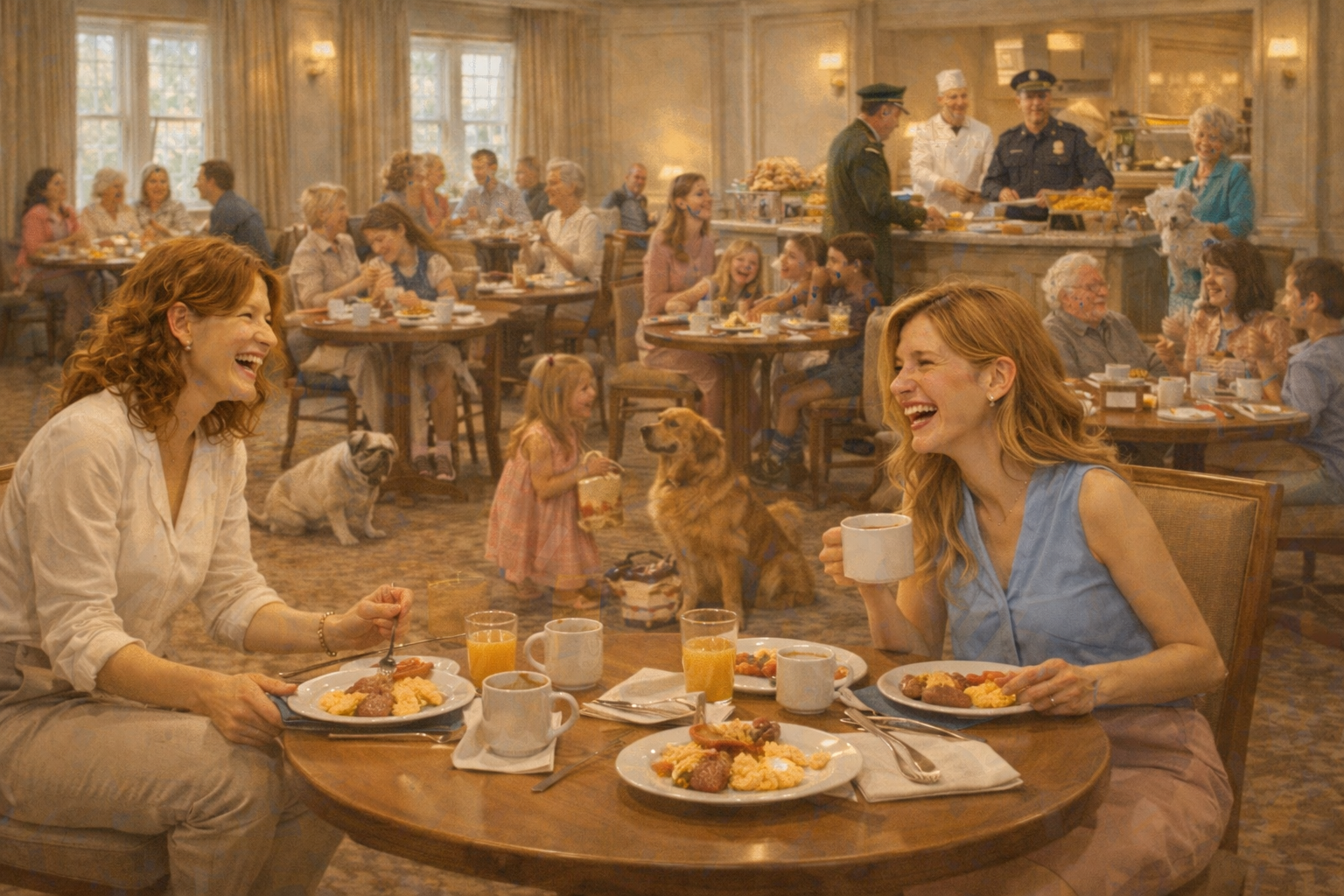 Breakfast at LOLbnb is held in a large, well-lit room that appears to have been designed by someone who believed chairs should be comfortable and people should be happier than strictly necessary. When Jezz enters, she immediately notices three things. First: the room is crowded. Second: everyone is smiling. Third: no one seems to know why. Adults, children, pets, staff—everyone is in a state of mild, unearned elation. It is not loud. It is not manic. It is simply… present. As if happiness has been placed on the menu and everyone has politely taken a portion. Jezz acquires a tray and begins the ancient ritual of breakfast selection, which involves pretending to consider fruit before taking something warm and hopeful. The eggs look unusually confident. The toast seems to believe in itself. A bowl of cereal gazes back at her with quiet approval. She sits at a table and looks around. No one is checking their phone. This is alarming.