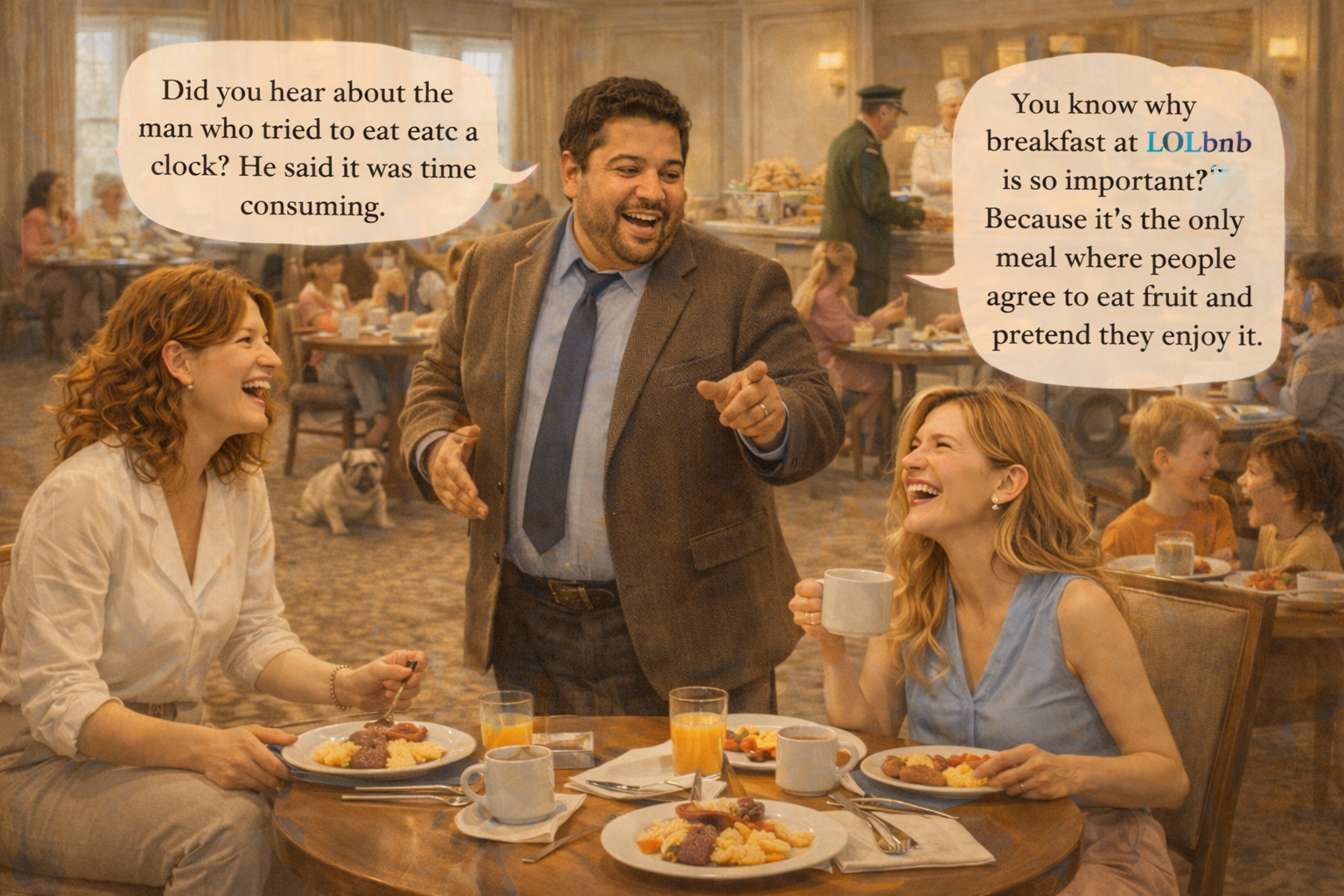 People are talking to each other. Entire conversations are occurring. A dog is listening intently to a man explaining something about taxes. The dog appears unconvinced but supportive. And then Brandon appears. Brandon is not introduced. He simply is, which is often the most effective way to enter a room. He looks like someone who has spent a long time being exactly where he needs to be without ever fully understanding how he got there. He stops at Jezz’s table. “Good morning,” Brandon says. “I tell jokes here.” Jezz nods, because this seems like the correct response. “You know why people enjoy breakfast at LOLbnb?” Brandon asks. “Because it’s the only time of day when coffee is both a beverage and a survival strategy.” Jezz laughs. She hadn’t planned to. Her face seems to have decided independently. Brandon smiles, ticks something invisible off an imaginary list, and moves on. At the next table sits Stephanie, a young woman engaged in a serious philosophical disagreement with a piece of toast. Brandon leans in. “Did you hear about the man who tried to eat a clock?” he asks. Stephanie sighs. She knows this is a trap. “It was time-consuming,” Brandon concludes. Stephanie laughs anyway, which annoys her slightly, because she prides herself on being selective.